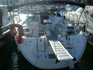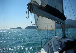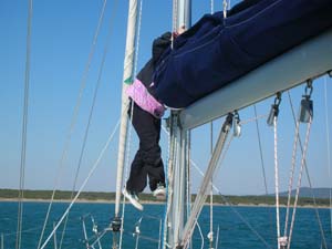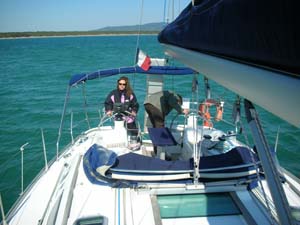 Subito dopo messe appunto le vele infatti abbiamo provato un bordo lingo verso Ansedonia durato anche poco visto che filavamo a ben 9 nodi con due mani di terzaroli e poco piu' di meta' Genoa fuori, traverso, traverso di ritorno, di nuovo un paio di giri e, una volta presa la mano al timone ci siamo diretti sfilando Porto Ercole a farfalla verso lo scoglietto proprio per provare un paio di strambate (li la tramontana picchia anche meno) Tornando indietro di bolina e' servito per capire un po' la straorza pero', infatti il vento sfiorava raffiche a 29 nodi, bella la tramontana eh! ^_^ ok per oggi e' stato abbastanza costruttivo, la barca infatti invelata solo di randa puo' perfettamente affrontare quei tipi di vento senza problemi, complice anche la morfologia del posto che non crea affatto mare con quel tipo di vento, questo per loro e' importante anche perche' presto sara' a bordo anche la piccola Valeri', terzo membro dell' equipaggio di Syria ma non per questo di grado inferiore al comandante.
